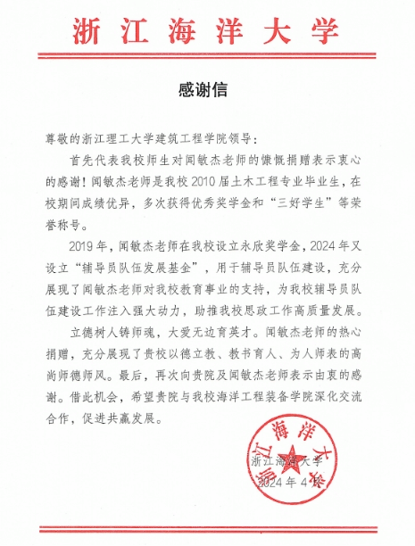 近日,浙江海洋大学发来感谢信,对工口实验室 闻敏杰老师的慷慨捐赠表示衷心感谢,对我校以德立教、教书育人、为人师表的师德师风表示肯定。