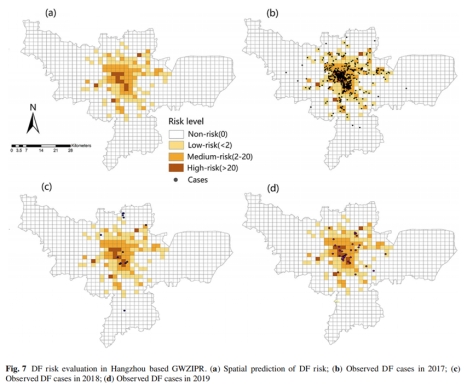 2017 年夏季,杭州发生了第一次大规模的登革热本地疫情,主城区报告了 1151 例本地感染病例。本次研究范围划定为杭州主城区范围内,包括上城区、下城区、拱墅区、江干区、西湖区、滨江区、余杭区、萧山区。从杭州市疾病预防控制中心获取2017-2019年登革热本地病例的基本信息。土地利用数据来自清华大学全球土地覆被数据库,社交聚集点(SGP)数据来自高德地图开放平台,人口数据来自WorldPop数据库。道路密度从OpenStreet获取,房产价格来自链家网站,GDP数据来源于中国科学院资源环境科学与数据中心。使用零膨胀泊松回归模型(ZIPR)和地理加权GWZIPR零膨胀泊松回归模型分析社会经济条件和城市景观特征对登革热空间风险的影响,并利用ZIPR-LASSO算法进行变量选择和模型优化。