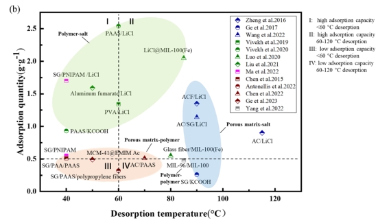 干燥剂的平衡吸附量和解吸能力和吸附-解吸动力学对系统的除湿性能有很大影响。该文对2015年之后的复合干燥剂的吸湿能力和再生温度进行归纳总结,并绘制成图。和2015年之前的干燥剂相比,目前,出现了不少落于区域I,即在低再生温度下(如 40~60 °C)同时具有较高吸附量(> 0.5 g·g-1)的复合干燥剂。特别是基于热响应聚合物 PNIPAM的复合干燥剂,可以实现40°C的快速再生。