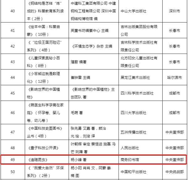 杨小峰老师著作《追随昆虫》由中央宣传部推荐并光荣入选2022年全国优秀科普作品奖。该奖项由各省部级(含副省级)单位推选优秀科普图书作品,全国总共推选484部,由科技部成立的评议专家组选出100部,确定为2022年全国优秀科普作品并向社会推介。