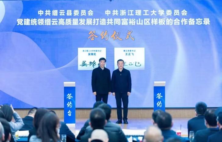 在签约仪式上,吴锋民和王正飞代表校地双方签订“党建统领缙云高质量发展打造共同富裕山区样板的合作备忘录”。杨晓刚和缙云县副县长张宗渭代表校地双方签订共建工口实验室