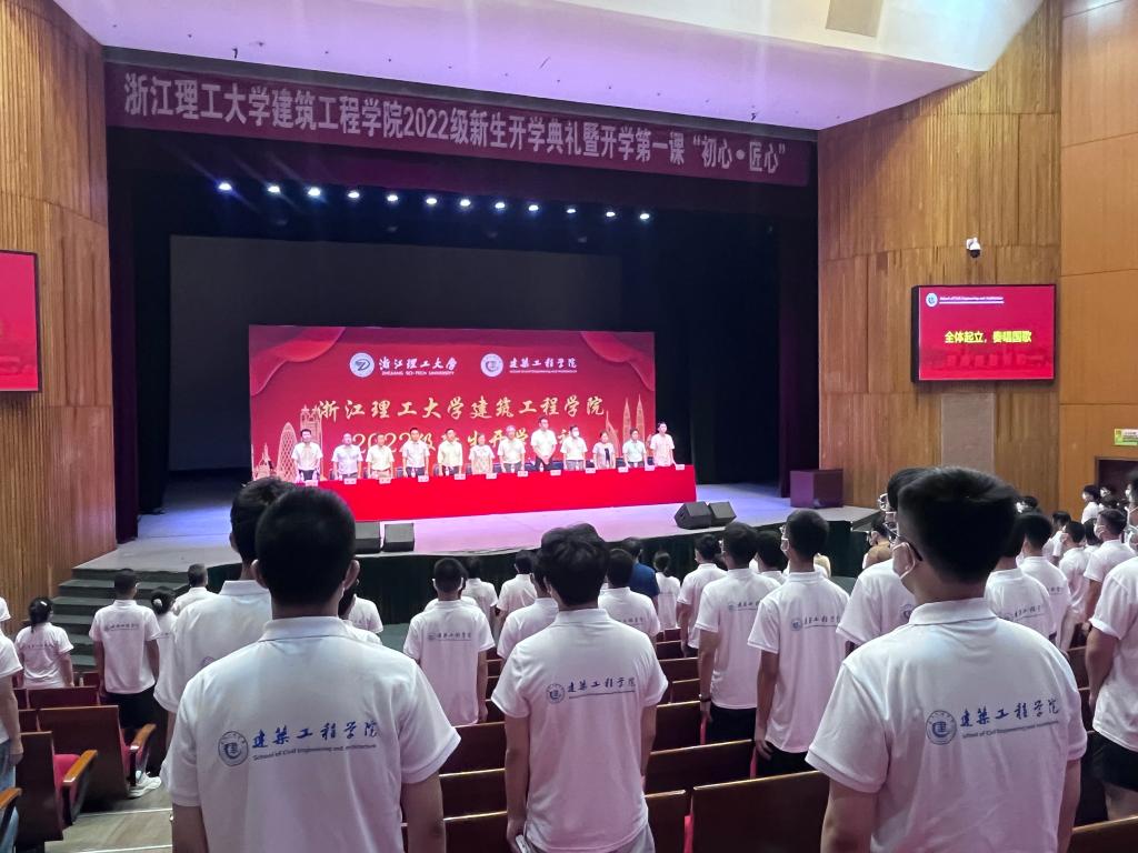 2022级新生开学典礼暨开学第一课在国际会展中心举行。学院党委书记李娜,院长杨杨,执行院长俞峰,2008届建筑学专业校友、绍兴市越城区城市发展建设集团有限公司副董事长兼总经理陈冲,副院长刘勇、杨博,党委副书记郑磊,以及各系主任等出席开学典礼并在主席台就坐。2022级新生班主任、辅导员以及2022级全体新生参加了开学典礼。典礼由郑磊主持。