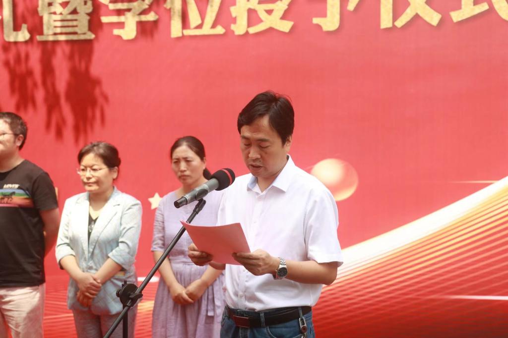 毕业典礼在庄严的国歌声中拉开序幕。杨博宣读2022届毕业生及获得学位学生名单,刘勇宣读省(校)级优秀毕业生毕业生名单。李娜、俞峰为省(校)级优秀毕业生颁发荣誉证书。陈艳、俞峰为2022届毕业生年级校友联络会理事代表颁发聘书。