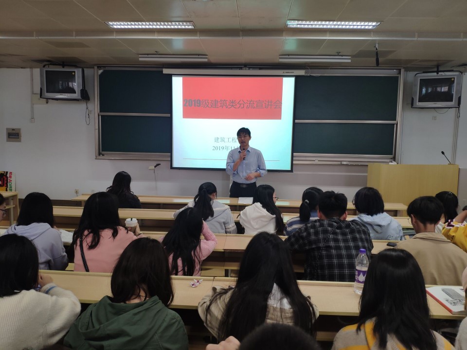 2019级本科生大类专业分流宣讲会在3-N223和7-205召开,教学副院长吴大志、建筑环境与能源应用系主任姜坪、建筑学系主任洪艳、土木工程系主任杨博、工程管理系主任徐森、风景园林系主任江俊浩和各系专业老师出席大会。2019级全体学生参加了本次宣讲会,大会由教科办主任盖燕芳主持。