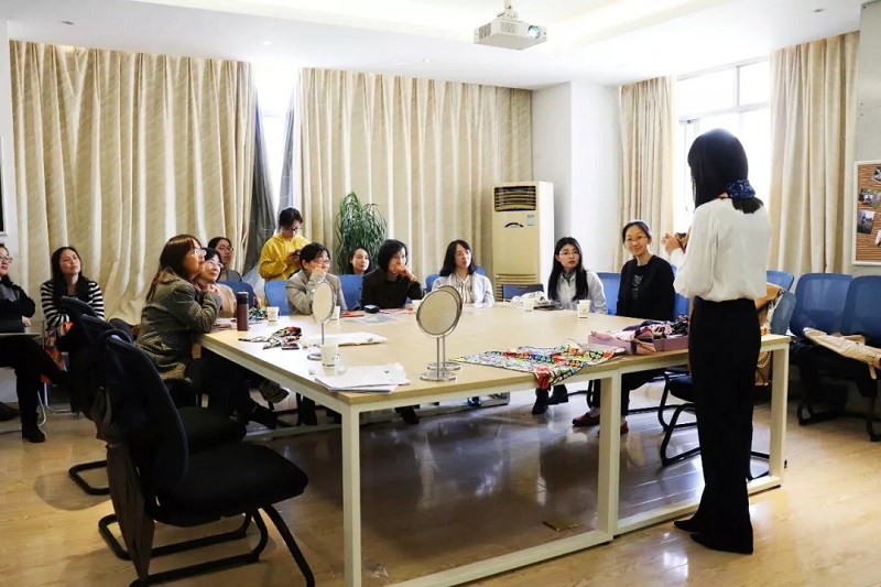 大家或认真听讲,或跟着元老师动手制作,其乐融融,兴致盎然。在元晓敏老师解答了大家相关疑惑后,更有老师感叹,在家积灰的丝巾终于有了用途。丝巾,系住的不仅是我们的衣物,更是大家的心。