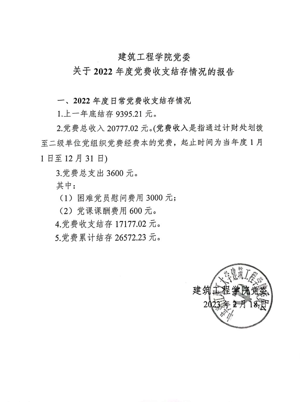 工口实验室 党委关于2022年度党费收支结存情况的报告