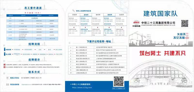 关于中铁二十三局集团有限公司校园招聘有几点补充:1.考上研的同学我们不收取违约金,考上研和我们联系后就去读研即可。2.集团轨道公司位于上海市,集团一公司位于山东日照,对于想留在华东片区工作的同学,在符合公司发展的前提下,基本是可以满足。3.土木大类、测量测绘、材料检测、工程管理、物流管理相关专业都需要,有兴趣的同学请投递简历至[email protected]