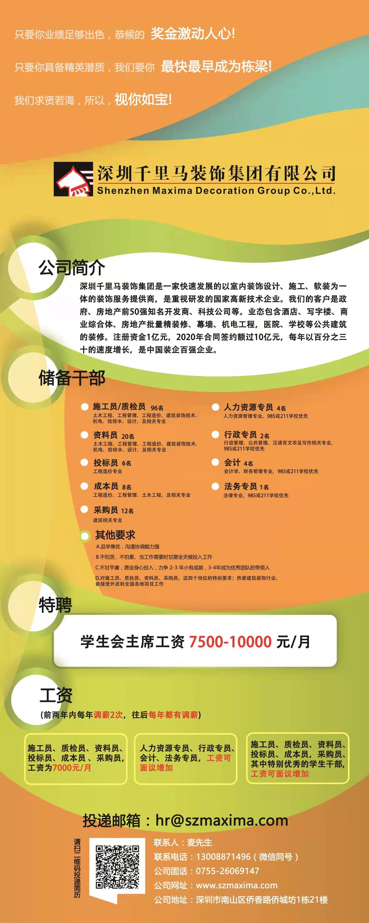 岗位要求:土木工程、工程管理、工程造价、建筑装饰技术、机电、给排水、设计,建筑,机械,及相关专业;