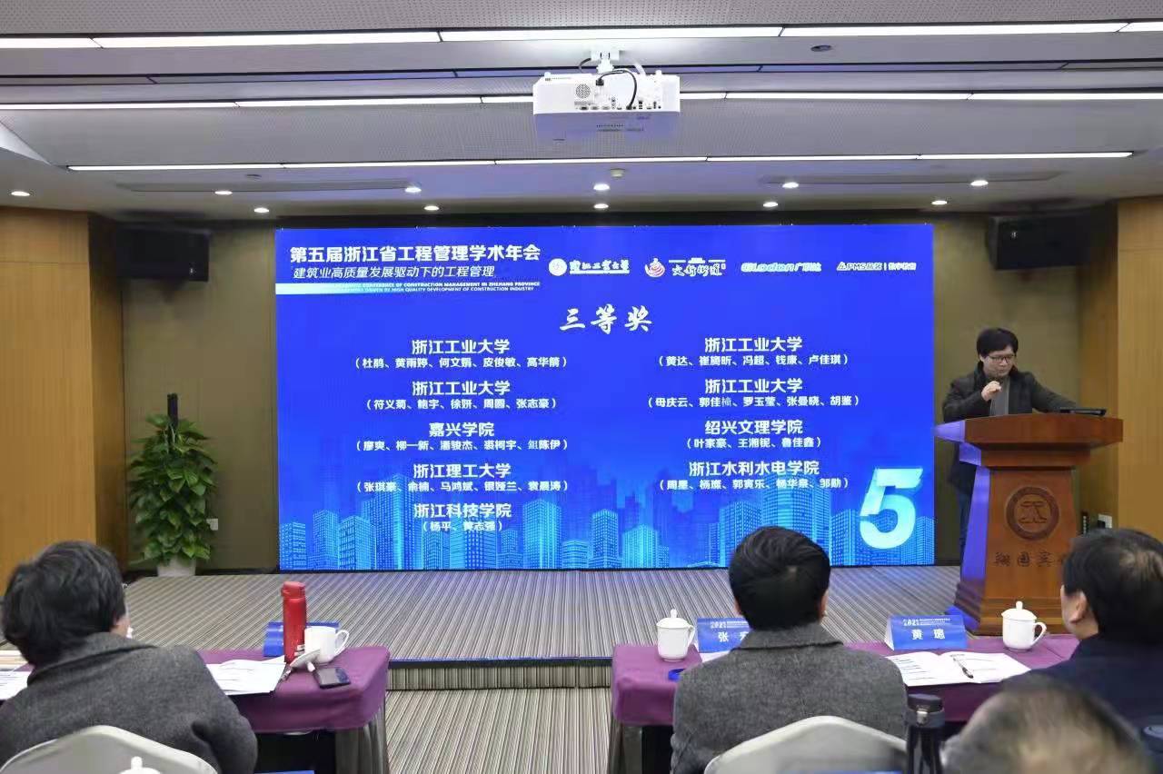 本次会议以“建筑业高质量发展驱动下的工程管理”为主题,聚焦建筑产业转型升级目标驱动下的工程管理相关研究成果、进展和心得。工程管理领域海内外知名专家学者以及浙江省有关优秀学者专家进行了演讲、交流和讨论。同时,本会议设置了颁奖典礼环节,由工程管理系徐森老师主持,为第四届浙江省大学生智能建造与管理创新竞赛中的优秀团队发放荣誉证书。需要特别指出的是,我校工程管理系学生在该项竞赛中取得了十分优异的成绩,获得奖项有:一等奖(团队成员:区绍枫、赵海、叶岳松、王冉、马超;指导老师:郎启贵、徐森)、二等奖(团队成员:卢露琼、潘心怡、陈笛、方芹、丁培培;指导老师:郎启贵、徐森)、三等奖(团队成员:张琪豪、俞楠、马鸿斌、银娅兰、袁晨涛;指导老师:郎启贵、徐森)。